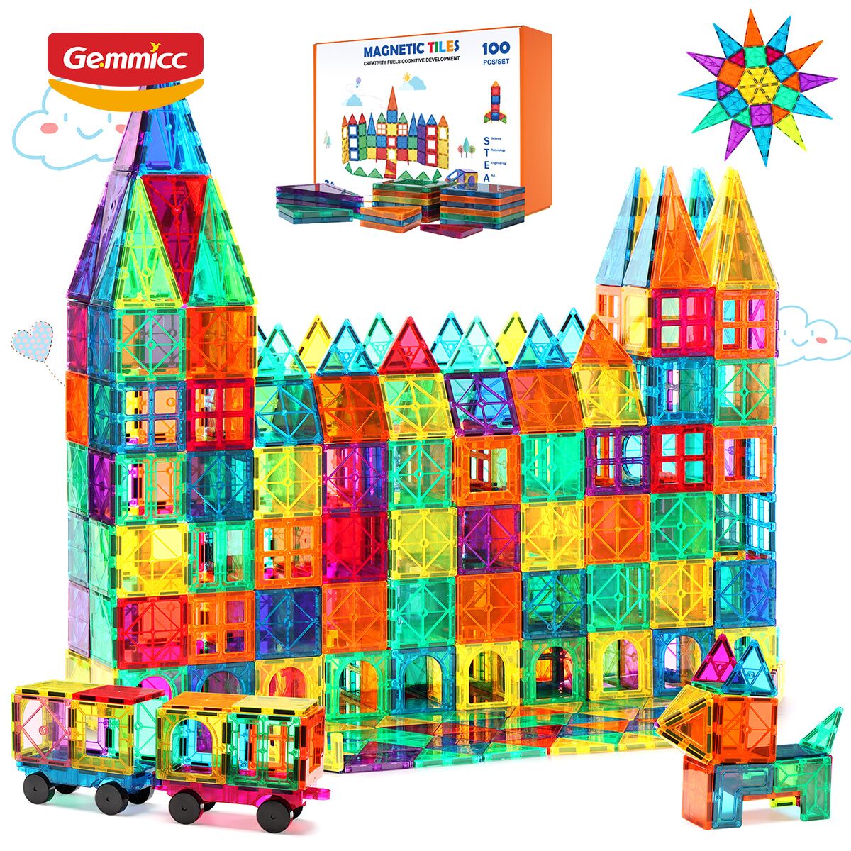 GM-MTS100 100 Pcs Magnetic Tiles Set, Deluxe 100 PCS Building Blocks Magnet Toys for Kids,3D Magnet Puzzles Stacking Blocks for Boys Girls,Huge Set with 2 Cars