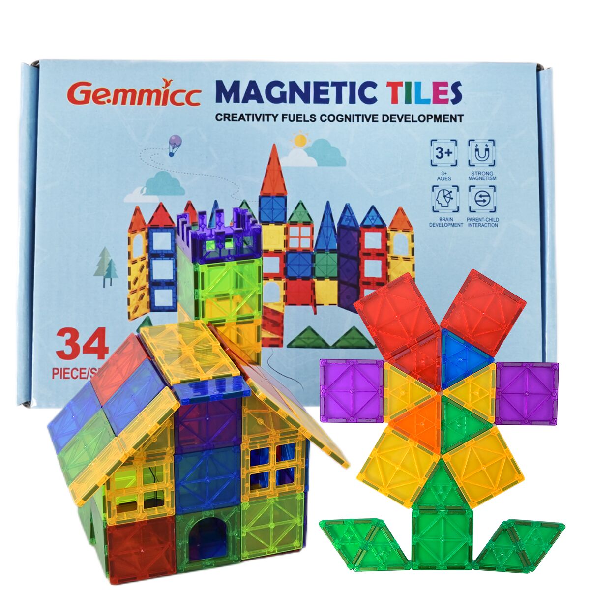 Gemmicc GM-MTS34 Magnetic Tiles, Magnet Toys Building Blocks for Kids, STEM Approved Educational Toys, Starter Set Magnet Puzzles Stacking Blocks,Sensory Montessori Toys for Boys Girls