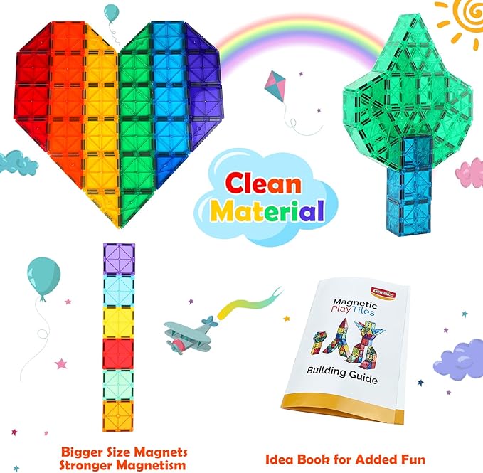 • Bang for the buck: Gemmicc magnet tiles set comes with more pieces and no useless plastic blocks compared with other brands, This magnetic building block set contains 98 PCS magnet tiles,2 PCS of magnetic cars and 1 idea book for added fun, and we never compromise on quality, every piece is self-produced and checked one by one.